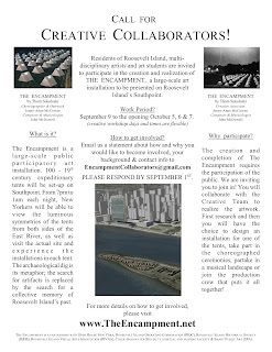 Thom Sokoloski, the artist behind The Encampment (October 5-7), sent a message asking for those interested in participating in the creation and realization of this project to be installed at Southpoint Park Roosevelt Island to contact him at EncampmentCollaborators@gmail.com. If you are interested please contact them by September 1.