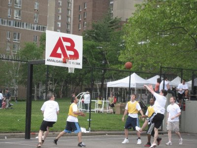 Is corporate sponsorship of public or municipal facilities a good idea? If a basketball backboard can be sponsored by a private company, why not a public ball field, tennis court or even the Roosevelt Island Tram though the NY City Council did pass a resolution banning advertising or sponsorship of the Tram. There is a poll on the right side column questioning whether corporate sponsorship of the Tram is a good or bad idea. What do you think?The Motorgate basketball courts were the site for some pretty rough and tumble 3 0n 3 hoops action this weekend during Roosevelt Island’s Health & Fitness Day. Another new Roosevelt Island blog , the blogging team of Scottandelly , were at the game. One played and the other captured the action.