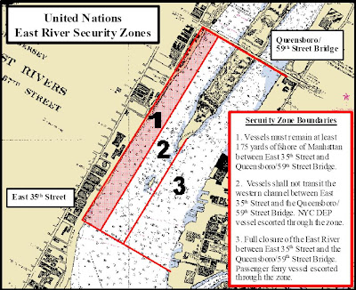 The Coast Guard will establish and enforce additional security zones on the East River, periodically restricting vessel traffic through the upper harbor near the United Nations Headquarters, starting at 7 a.m., Sept. 20, 2010.