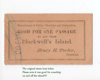 At the time this steam boat ticket was used, Roosevelt Island was named Blackwell’s Island and the ferry was used for transporting visitors to the penitentiary on what is now Roosevelt Island. From Ms. Berdy: