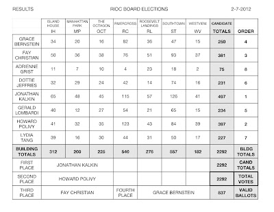 Around 11:15 Tuesday evening, Ashton Barfield announced the winners of the Roosevelt Island Operating Corp (RIOC) Board of Director Nominees elections. The winners and three highest vote getters were: