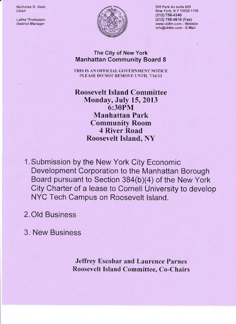 UPDATE 7/16 – CB 8 Roosevelt Island Committee recommended disapproval of EDC lease with Cornell NYC Tech at last night’s meeting. Full CB 8 Board will vote on the issue Wednesday July 17. The EDC, Cornell and elected officials reps did not look very happy following the meeting.
