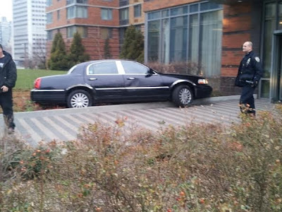 A limo nearly crashed into the Roosevelt Island 425 Main Street Riverwalk building lobby yesterday morning. A Roosevelt Island resident shares this photo