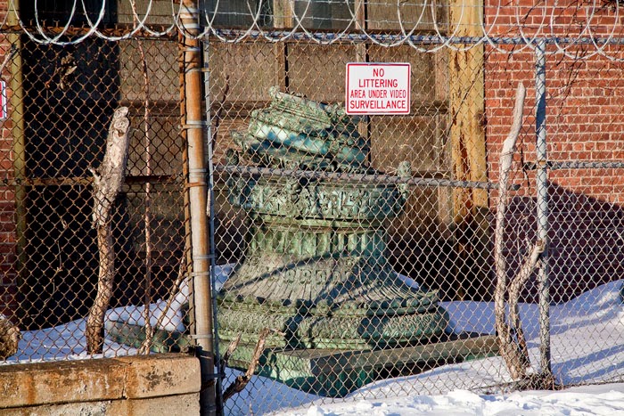 Something about this object was familiar to me, but its identity eluded. My thoughts keep drifting toward mental catalogs of midtown Manhattan transportation centers for some reason. Grand Central perhaps? Simple observations of the object revealed it to be metallic, and designed to exhibit a cuprous patina. Were it composed of copper or white bronze, as it is designed to appear, this would be a small fortune sitting out in the snow (from a scrap metal point of view)…