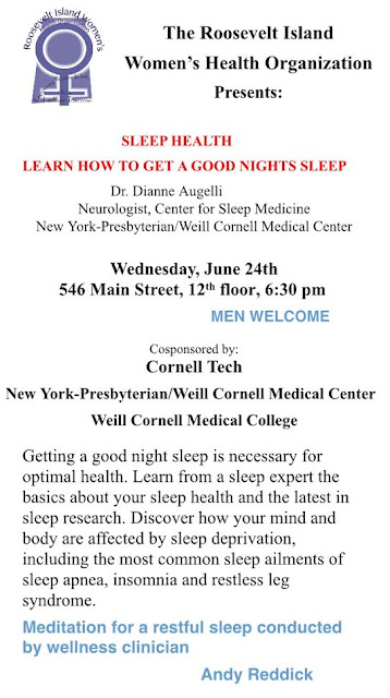 The Roosevelt Island Womens Health Organization (RIWHO) has joined with Cornell Tech , Weill Cornell Medical College and New York Presbyterian/Weill Cornell Medical Center to offer a series of health related seminars to the Roosevelt Island community (Men welcome too).