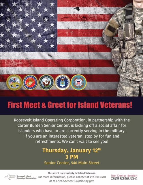 In partnership with the Carter Burden Senior Center, Roosevelt Island Operating Corporation will kick off its first social affair for island veterans on Thursday, January 12th at 3 PM at the Senior Center, located on 546 Main Street. Stop by for fun, refreshments, and to socialize with fellow islanders who have or are currently serving in the military. We hope to see you there!