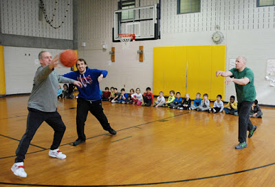 Parents can help with coaching, such as parent Ben shows how to fake and shoot. The instruction ends with the coach explaining some of the finer points, and then a Hands In!