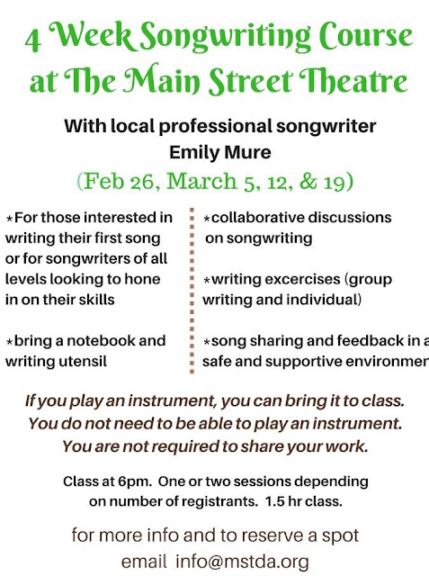 Songwriting Workshop 2/26-3/19 ages 13+. Interested in songwriting? This workshop will use collaborative discussion and writing exercises to teach the components of songwriting to students. If you play an instrument, bring it to class. Cost of 4 week program, $100. To register email info@mstda.org