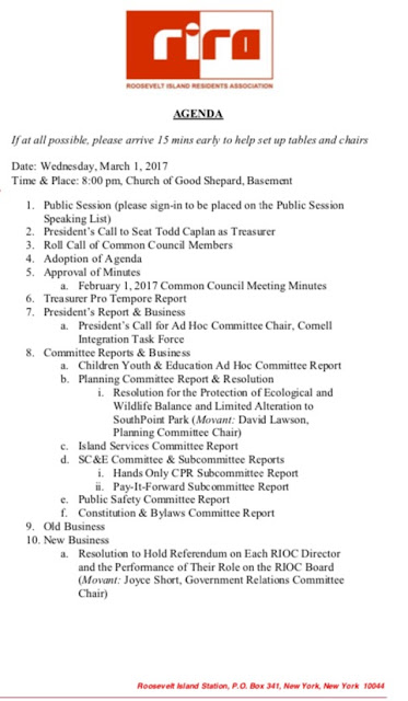 The Roosevelt Island Residents Association (RIRA) Common Council will hold it’s monthly meeting this evening, March 1, at 8:00 PM in the Good Shepherd Community Center (543 Main Street).