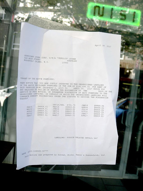According to the notice, Trellis is in arrears on rent to Hudson Related Retail from December 2015 to April 2017 in the amount of $142,695.92.