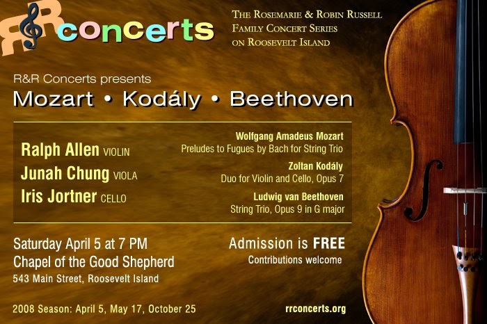 Posted inUncategorized Rosemarie & Robin Russell Family Concert Series Continues – Enjoy Schumann, Bach and Mozart on Roosevelt Island, Saturday May 17 by Roosevelt Islander May 14, 2008 11:59 am