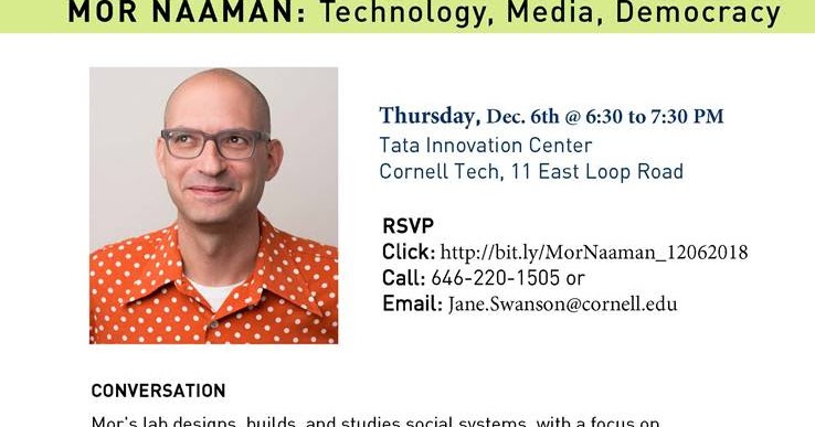 Posted inUncategorized Part 3 Of Cornell Tech Roosevelt Island Community Conversations With Faculty Members – Connective Media Professor Mor Naaman Presentation On Tech, Media & Democracy Thursday December 6 by Roosevelt Islander December 3, 2018 4:58 pmJuly 11, 2022 9:04 pm