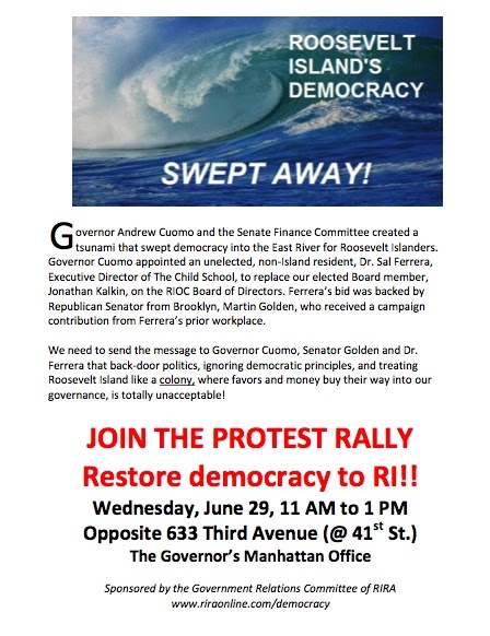 Posted inUncategorized Roosevelt Island Operating Corp Resident Directors Send Letter To NY Governor Andrew Cuomo Objecting To Conflict Ridden, Non-Resident, Non-Elected RIOC Board Appointment – Join The Protest Demonstration Tomorrow In Front Of Governor’s Office by Roosevelt Islander June 28, 2011 7:31 pm