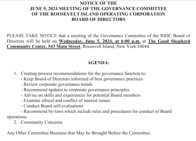 The Roosevelt Island Operating Corp ( RIOC ) Governance Committee is meeting tomorrow, Wednesday June 5. According to RIOC : PLEASE T…