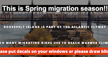 Posted inUncategorized Many Spring Migratory Birds Stunned, Injured Or Killed Each Year Colliding With Roosevelt Island Buildings – You Can Help Prevent By Making Your Windows Visible To Birds Says Wildlife Freedom Foundation President by Roosevelt Islander April 5, 2016 1:18 pm